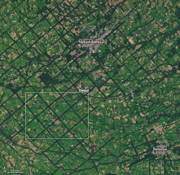 The strips are forested windbreaks—180-meter (590-foot) wide rows of coniferous trees that help shelter grasslands and animals from Hokkaido’s sometimes harsh weather. In addition to blocking winds and blowing snow during frigid, foggy winters, they help prevent winds from scattering soil and manure during the warmer months in this major dairy farming region of Japan. The thinner, less regular strips are forested areas along streams.