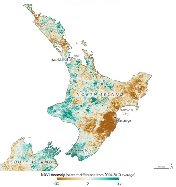 The drought’s impact on plants and trees is visible in these natural-color images, acquired with the Moderate Resolution Imaging Spectrometer (MODIS) on NASA’s Aqua satellite. The right image shows North Island’s Hawke’s Bay region on April 29, 2020; the left image shows the same region on May 2, 2019 (a more typical year). Much of the light green areas, which saw the most change, are pastoral and agricultural land; darker green areas are forested.