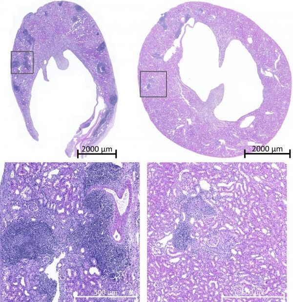 Image: Image of transplanted mouse kidney tissues showing recipient immune cells (blue) in normal (left) but not genetically modified mice (right). (Credit: Image adapted from Dai H et al., Science (2020))