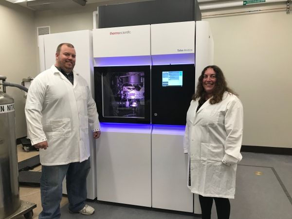 Image: Jason Schrad (left) and Kristin Parent pose next to a Talos Arctica microscope, a specialized instrument that images frozen samples to provide atomic level molecular structures. (Credit: Photo by John A. Dover)