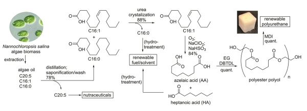 Figure: Scheme 1 shows the pathway to renewable polyurethane, n-hexane and methyl heptanoate synthesis from algae biomass. Figure courtesy of the UC San Diego research team