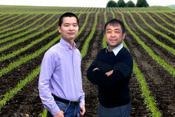 Image: Researchers Bin Peng, left, and Kaiyu Guan led a large, multi-institutional study that calls for a better representation of plant genetics data in the models used to understand crop adaptation and food security during climate change. (Credit: Photo illustration by Fred Zwicky)