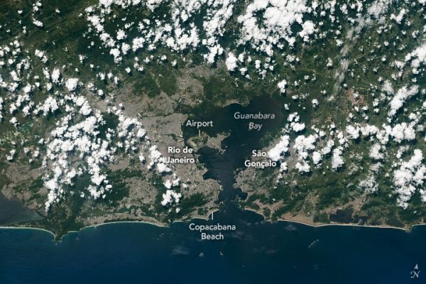 Popcorn clouds dot the landscape over the Brazilian cities of Rio de Janeiro and São Gonçalo in this photograph taken by an astronaut looking down from the International Space Station (ISS). Rio de Janeiro is home to more than 6.5 million people.