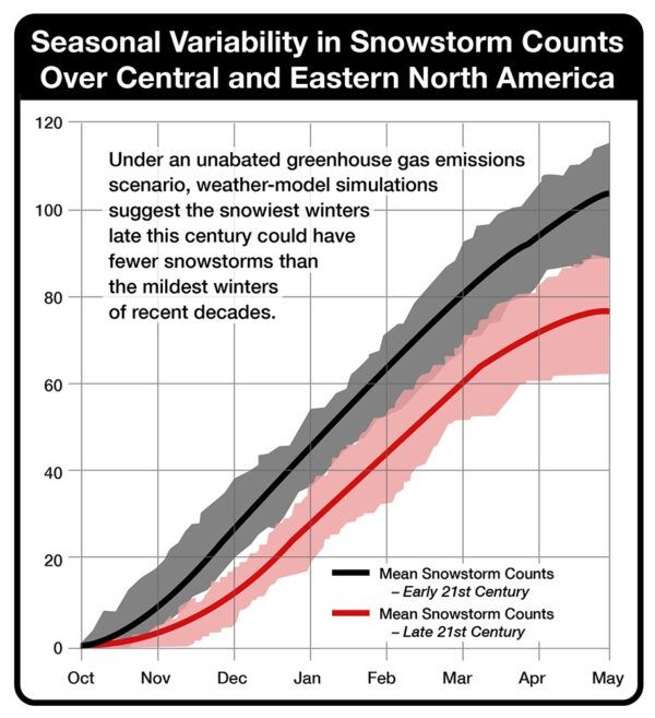Under an unabated greenhouse gas emissions scenario, the study projects 28% fewer snowstorms on average per year over central and eastern portions of North America by the century’s last decade, with one-third the amount of snow or frozen precipitation and a 38% loss in average snowstorm size.