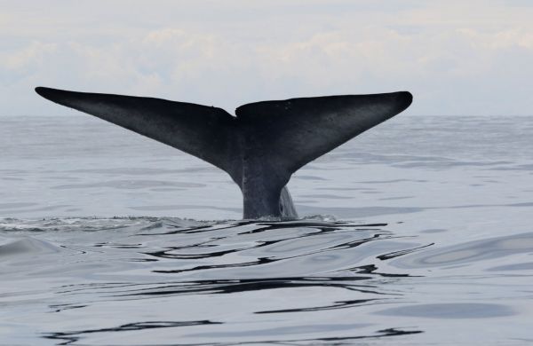 Photo: A blue whale shows its fluke as it dives deep in an area with abundant krill in New Zealand's South Taranaki Bight. Photo credit: Leigh Torres.