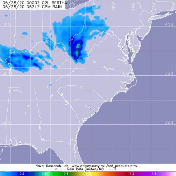 Image: The GPM’s core satellite passed over Bertha and analyzed its rainfall rates on May 28 at 1:21 a.m. EDT (0521UTC). GPM found heaviest rainfall over south central West Virginia, where rain was falling at rates of 1 inch (25 mm) per hour. A large area of light rain northwest of the center was falling at around 0.2 inches (less than 5 millimeters) per hour. Credit: NASA/NRL