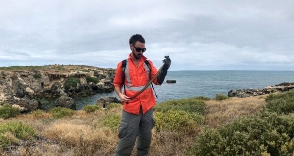 Image: Lead researcher PhD Candidate Mr Damian Lettoof holding a tiger snake. CREDIT: Curtin University