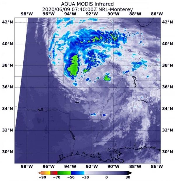 On June 9 at 3:40 a.m. EDT (0740 UTC) the Moderate Resolution Imaging Spectroradiometer (MODIS) instrument that flies aboard NASA’s Aqua satellite showed strongest storms in Tropical Depression Cristobal were northeast and north of the elongated center over western Missouri, Iowa and Illinois, where cloud top temperatures were as cold as minus 63 degrees Fahrenheit (minus 56.6 Celsius). NASA research has shown that storms with cloud top temperatures that cold have the ability to generate heavy rainfall.