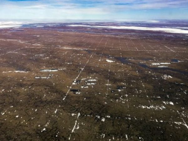 A grid pattern of seismic survey lines is used to study underground geology. Research determined these trails, as well as trails caused by camps that support workers, damage the underlying tundra, even when limited to frozen, snow-covered conditions.