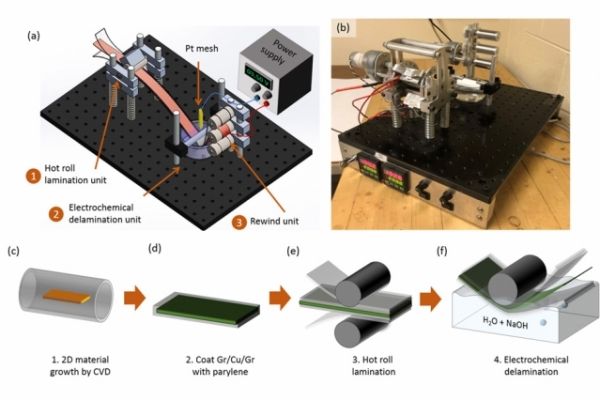 Image: A new manufacturing process for graphene is based on using an intermediate carrier layer of material after the graphene is laid down through a vapor deposition process. The carrier allows the ultrathin graphene sheet, less than a nanometer (billionth of a meter) thick, to be easily lifted off from a substrate, allowing for rapid roll-to-roll manufacturing. These figures show this process for making graphene sheets, along with a photo of the proof-of-concept device used (b).