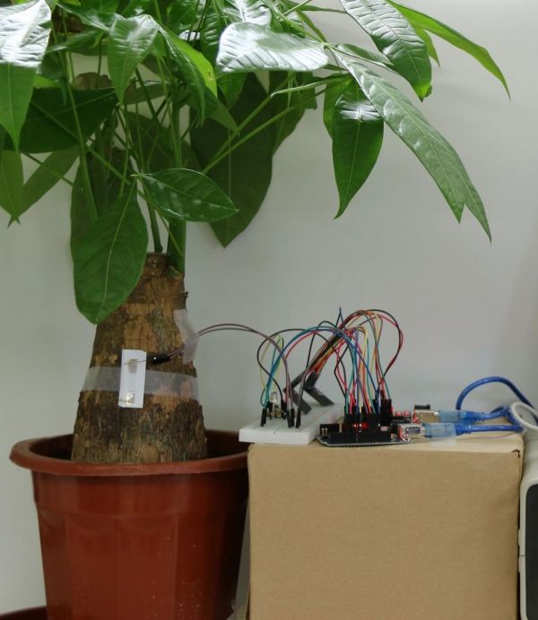 Image: A sensor (white strip) on a houseplant activates an alarm when fire is near. (Credit: Adapted from ACS Applied Materials & Interfaces 2020, DOI: 10.1021/acsami.0c04798)
