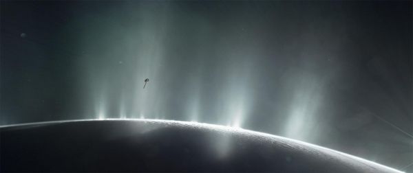 Image: This illustration shows NASA's Cassini spacecraft flying through plumes on Enceladus in October 2015. (Credit: NASA/JPL-Caltech)