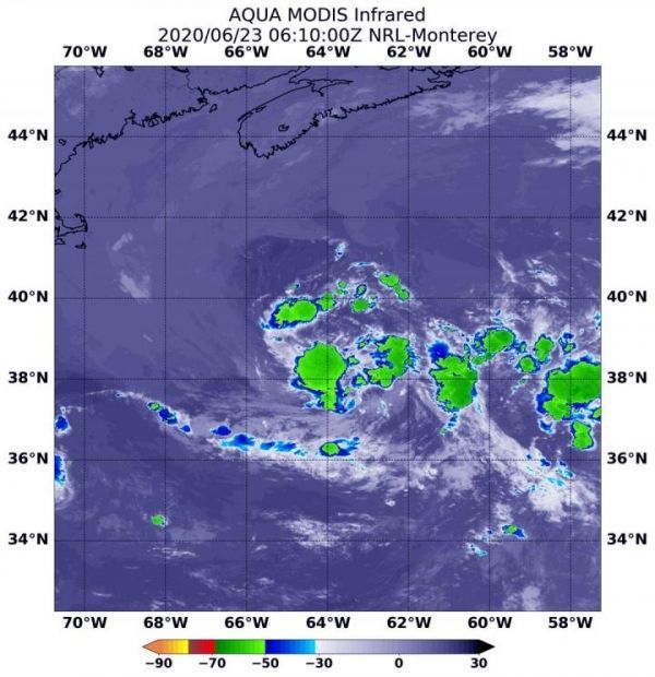On June 23 at 2:10 a.m. EDT (0610 UTC), NASA's Aqua satellite found several fragmented and disorganized thunderstorms circling the center of circulation of Subtropical Depression 4, where cloud top temperatures as cold as or colder than minus 50 degrees Fahrenheit (minus 45.5 Celsius). (Photo Credit: Credit: NASA/NRL)