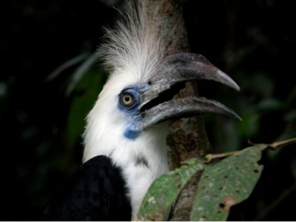 Areas of natural forest on oil palm plantations play an important role in protecting species such as the white-crowned hornbill. (Photo credit: Rob Colgan)