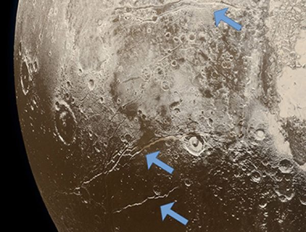 Image: Extensional faults (arrows) on the surface of Pluto indicate expansion of the dwarf planet’s icy crust, attributed to freezing of a subsurface ocean. (Image credit: NASA/Johns Hopkins University Applied Physics Laboratory/Southwest Research Institute/Alex Parker)