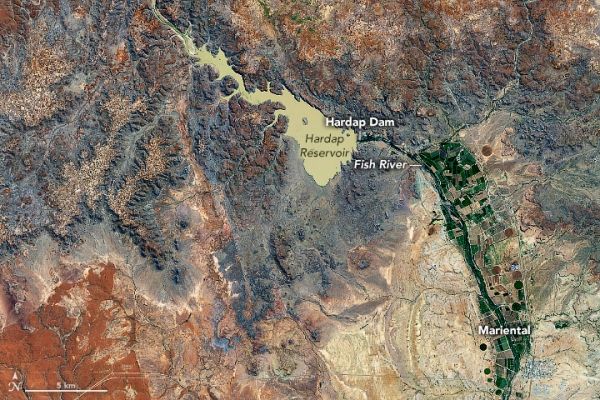 The image above shows the convergence of two contrasting geologic regions near the town of Mariental in south-central Namibia. The semi-arid sandy savannah of the Kalahari Desert lies to the east of the town, while the rocky plains of the Central Plataeu are located to the west. The image was acquired on May 9, 2020, by the Operational Land Imager (OLI) on Landsat 8.