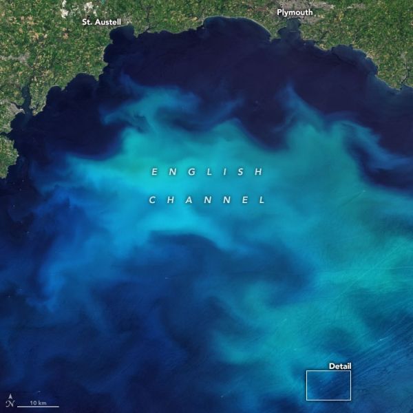 On June 23, 2020, the Operational Land Imager (OLI) on Landsat 8 acquired natural-color imagery (above) of a massive phytoplankton bloom off the coast of southwestern England. The next day, the Moderate Resolution Imaging Spectroradiometer (MODIS) instrument on NASA’s Terra satellite observed the same bloom in a wider context (below), and phytoplankton are also visible in the North Sea.