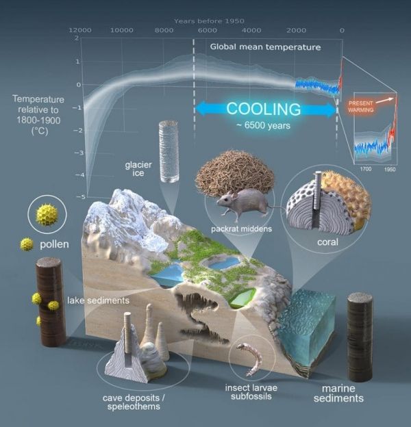 The findings show the millennial-scale global cooling began approximately 6,500 years ago when the long-term average global temperature topped out at about 0.7 degrees C warmer than the mid-19th century. Since then, accelerating greenhouse gas emissions have contributed to global average temperatures that are now surpassing 1 degree C above the mid-19th century.