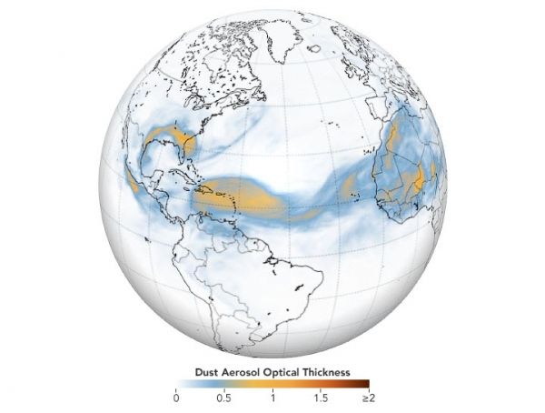 Such superlatives are backed by data. One preliminary analysis of aerosol optical depth (AOD) measurements from NASA’s Moderate Resolution Imaging Spectroradiometer (MODIS) sensor showed a greater concentration of dust in the atmosphere over the Atlantic Ocean on June 20 than on any other day since 2003. AOD is a unitless measurement of how much light the airborne particles prevent from traveling through the atmosphere. A few days later, a ground-based AERONET sensor at Ragged Point, Barbados, recorded the all-time highest AOD value the site has recorded since 1996.