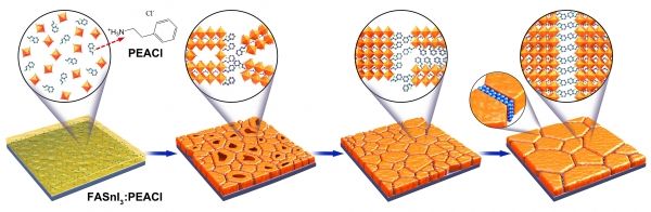 Now, an international cooperation led by Antonio Abate, HZB, and Zhao-Kui Wang, Institute of Functional Nano & Soft Materials (FUNSOM), Soochow University, China, has achieved a breakthrough that opens up a path to non-toxic perovskite-based solar cells that provides stable performance over a long period. They also use tin instead of lead but have created a two-dimensional structure by inserting organic groups within the material, which leads to so-called 2D Ruddlesden-Popper phases. "We use phenylethylammonium chloride (PEACl) as an additive to the perovskite layers. Then we carry out a heat treatment while the PEACl molecules migrate into the perovskite layer. This results in vertically ordered stacks of two-dimensional perovskite crystals" explains first author Dr Meng Li. Li is a postdoc in Abate’s group and has organised the close cooperation with the Chinese partners. At the Shanghai Synchrotron Radiation Facility (SSRF), they were able to precisely analyse the morphology and crystal characteristics of the perovskite films after different annealing treatments.