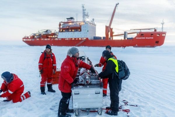 Photo: With the support of the Russian research vessel Akademik Fedorov and Russian helicopters, a Distributed Network of autonomous buoys was installed in a 40-km radius around the MOSAiC floe on 55 additional residual ice floes of similar age. CREDIT: Mario Hoppmann