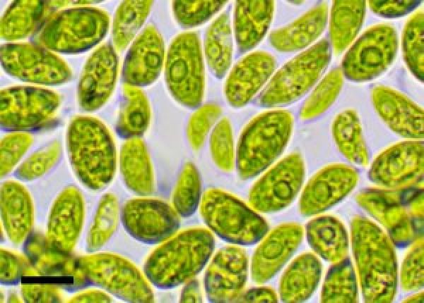 These tiny green algae (many just a few microns in size) live embedded in microbiotic soil crusts, which are characteristic of arid areas and are formed by communities of bacteria, lichens, microalgae, fungi, and even small mosses. After completely drying out, the algae can become active and start photosynthesizing again within seconds of receiving a drop of water.