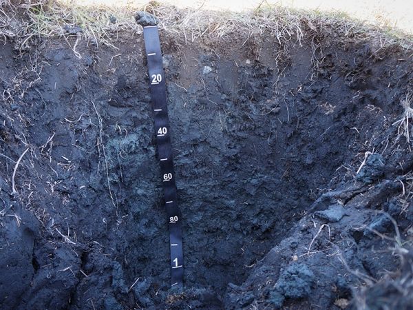 Image: This soil profile of a research site shows the dark color of the soil. Credit: Karen Vaughan