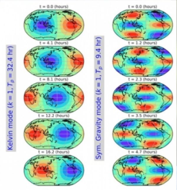 In the case of the atmosphere, the “music” comes not as a sound we could hear, but in the form of large-scale waves of atmospheric pressure spanning the globe and traveling around the equator, some moving east-to-west and others west-to-east. Each of these waves is a resonant vibration of the global atmosphere, analogous to one of the resonant pitches of a bell.