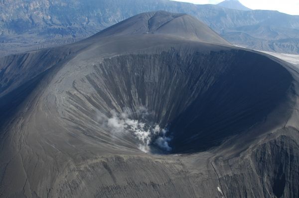 Image: Looking into the new tephra cone with Cone D, mantled thickly by debris, behind it. Tulik in the far distance outside the caldera. We estimated the new cone to rise about 800-900 feet from the old lake level out of the photo to the left. The crater is about 2500 feet across The bottom of the crater is filling with fine debris raining in down the very steep crater walls; on the 10th, we looked in and saw an accumulation of gray lithic blocks probably ballistics similar to what we found on the rim (all old dense lavas). The steaming was from a diffuse area on the crater floor with a few more strongly steaming jets; we could usually smell very faint H2S if flying close to the rim. Image Credit: Christina Neal / Alaska Volcano Observatory, USGS
