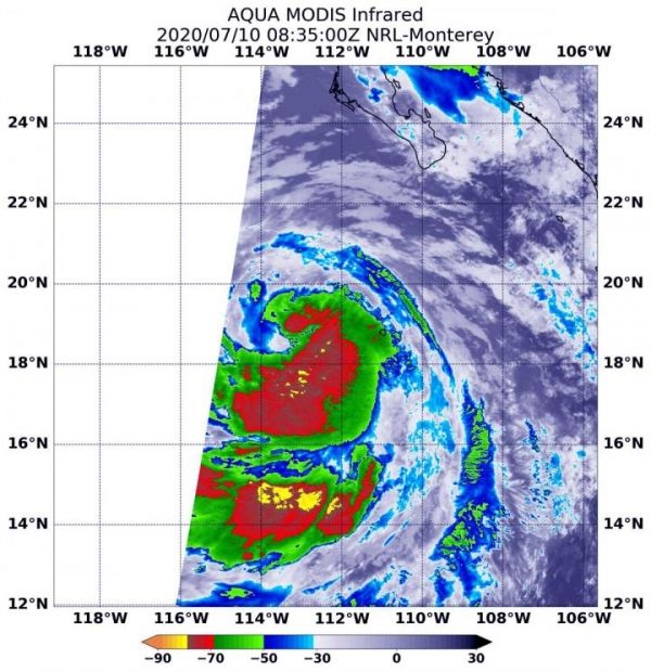 On July 10 at 4:35 a.m. EDT (0835 UTC), the MODIS instrument aboard NASA’s Aqua satellite analyzed Tropical Storm Cristina’s cloud tops in infrared light. Infrared data provides temperature information, and the strongest thunderstorms that reach high into the atmosphere have the coldest cloud top temperatures.