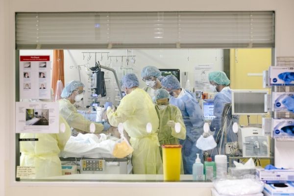 Treatment of a patient with Covid-19 in the intensive care unit of the University Hospital Basel. (Photo Credit: University Hospital Basel, Fabian Fiechter)