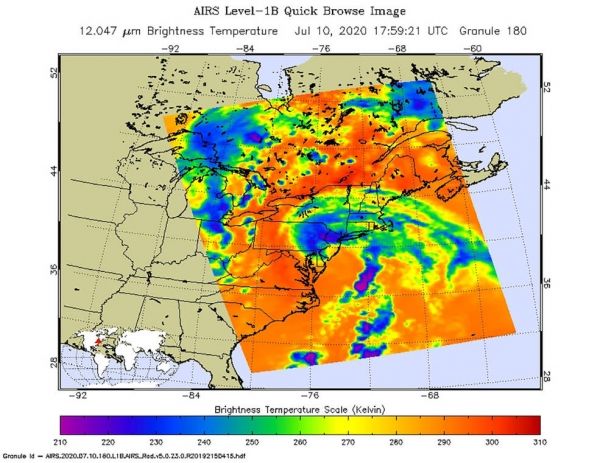 NASA's Atmospheric Infrared Sounder (AIRS) collected this image at around 2 p.m. local time on Friday, July 10. The purple regions indicate very cold clouds lofted high into the atmosphere by the storm and generally linked to heavy rainfall. Warmer clouds closer to the ground show up as green and blue, while the orange areas denote mostly cloud-free parts of the sky.