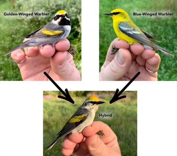 Image: While blue-winged warblers have predominantly yellow underparts, golden-winged warblers have white bellies and a black throat patch and face mask. Hybrid offspring of blue-winged and golden-winged warblers have a mix of coloration from the two parent species. (Credit: David Toews, Penn State)