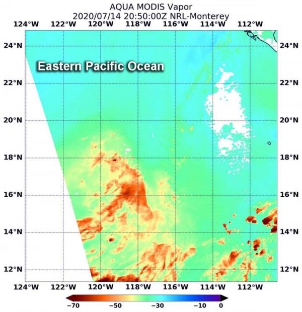 On July 14 at 4:50 p.m. EDT (2050 UTC), NASA’s Aqua satellite passed over the remnants of Tropical Depression 06E. The Moderate Resolution Imaging Spectroradiometer or MODIS instrument aboard Aqua gathered the water vapor content and temperature information. MODIS found minimal concentrations of water vapor and the circulation had opened up into a trough.