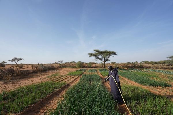 Image: A man waters his crops near Lampsar, a community about 12 miles from the city of Saint Louis in the lower Senegal River Basin in West Africa. A new study led by researchers at the University of California, Berkeley finds that use of some agricultural pesticides can speed the transmission of the debilitating disease schistosomiasis, while also upsetting the ecological balances in aquatic environments that prevent infections. (Credit: Planetary Health Alliance photo by Hillary Duff)