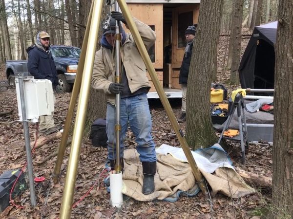 Image: A Penn State-led research team found that seismic waves can "see" chemical reactions occurring deep below ground and help to protect groundwater resources. Pictured, Brad Carr, University of Wyoming, removes a logging instrument from a borehole in the valley floor at Shale Hills. Looking on are Penn State graduate student Andrew Shaughnessy (left) and postdoctoral scholar Xin Gu (right). (Credit: FRANCISCO TUTELLA)