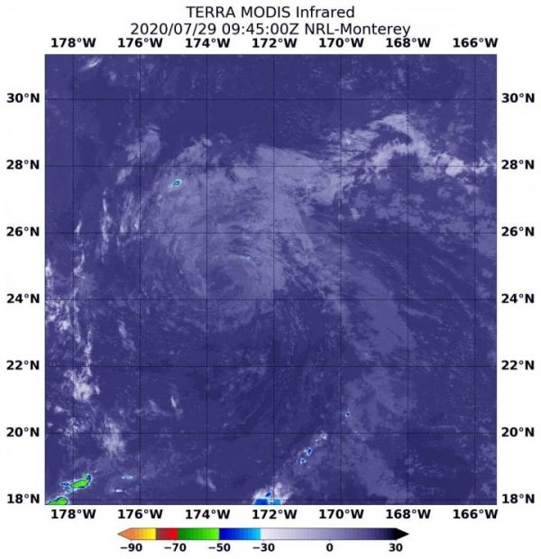 NASA’s Terra satellite uses infrared light to analyze the strength of storms by providing temperature information about the system’s clouds. The strongest thunderstorms that reach high into the atmosphere have the coldest cloud top temperatures. However, cloud tops in Douglas showed no very cold cloud tops on July 29 at 5:45 a.m. EDT (0945 UTC) when they were imaged by the Moderate Resolution Imaging Spectroradiometer or MODIS instrument that flies aboard NASA’s Terra satellite.