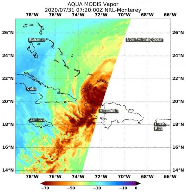 Image: On July 31 at 3:20 a.m. EDT (0720 UTC), NASA's Aqua satellite passed over Hurricane Isaias as it departed Hispaniola. Aqua found highest concentrations of water vapor (brown) and coldest cloud top temperatures were around the center. (Credit: NASA/NRL)