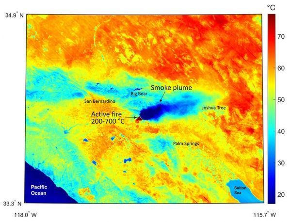 ECOSTRESS recorded the image above at 1:15 p.m. PST (4:15 p.m. EDT) on Saturday, Aug. 1, 2020, when the burn area was approximately 4,000 acres in size. In the image, the black smoke plume can be seen drifting east and over Joshua Tree National Park in the Mojave Desert. With a spatial resolution of about 77 by 77 yards (70 by 70 meters), the image enables researchers to study surface-temperature conditions down to the size of a football field.