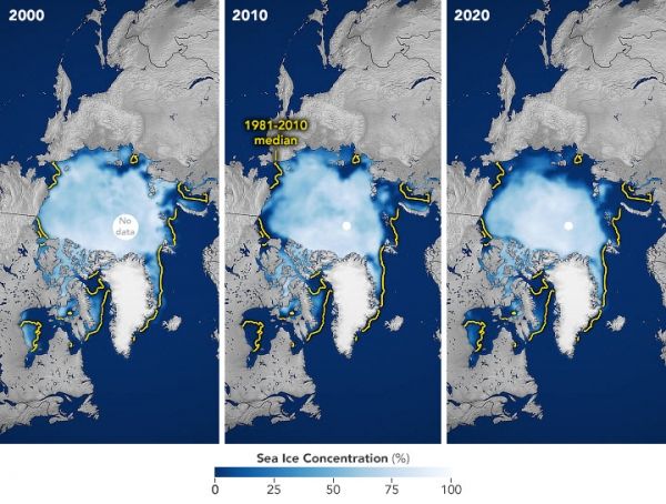 The maps above show the sea ice extent in the Arctic Ocean for July 2020 (above, right) in context with sea ice from July 2000 and 2010. Extent is defined as the total area in which the ice concentration is at least 15 percent—the minimum amount at which space-based measurements give a reliable measurement. The yellow outline on each map shows the 30-year median extent for the month.