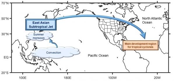 Rossby waves occur naturally within the Earth’s oceans and atmosphere, forming because of the planet’s rotation. The researchers say Rossby waves hitch a ride on the EASJ to the North Atlantic when tropical cyclones in the Atlantic are most likely to form. The waves affect wind shear, a key element in the formation of tropical storms.
