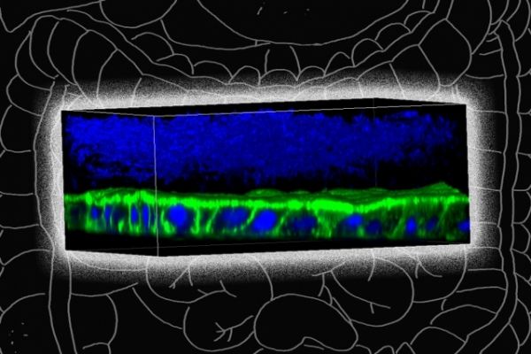 Image: MIT biological and mechanical engineers have designed a specialized device in which they can grow oxygen-intolerant bacteria in tissue that replicates the lining of the colon. F. prausnitzii bacteria (blue, at top of image) grow above a layer of human mucosal barrier cells (green and blue).