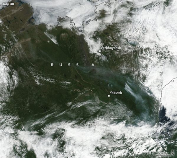 Abnormally warm temperatures have spawned an intense fire season in eastern Siberia this summer. Satellite data show that fires have been more abundant, more widespread, and produced more carbon emissions than recent seasons.