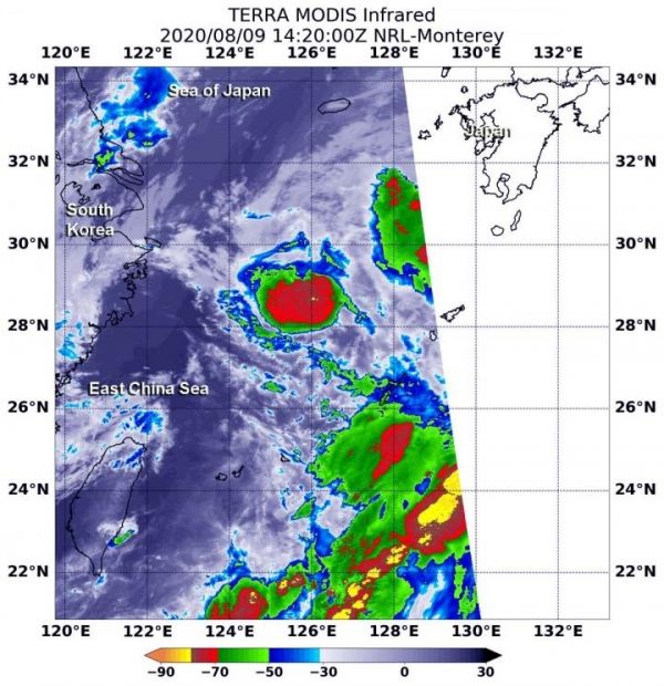 On Aug. 9 at 10:20 a.m. EDT (1420 UTC) infrared data from the Moderate Resolution Imaging Spectroradiometer or MODIS instrument that flies aboard NASA’s Aqua satellite provided a look at cloud top temperatures in Tropical Storm Jangmi as it was about to move out of the East China Sea. Strongest thunderstorms that reach high into the atmosphere have the coldest cloud top temperatures.
