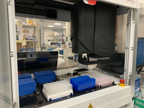 Image: GIFS' liquid handling robot used to automate the dispensing of specific amounts of liquids to containers in the lab. (Credit: Pierre-Luc Pradier)