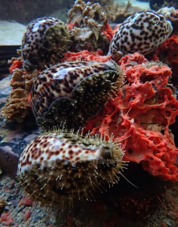 The Hawaiian tiger cowrie (Leho-kiko in Hawaiian) is a voracious predator of alien sponges such as the orange keyhole sponge, which can overgrow native corals and has become a concern as it spreads across reefs in Kāneʻohe Bay, Oʻahu. This was discovered by researchers at the University of Hawai‘i at Mānoa’s Hawaiʻi Institute of Marine Biology (HIMB) in a study published in Marine Ecology Progress Series, which found that each cowrie, a type of sea snail, eats more than half its body weight in sponges every week.