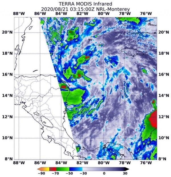 On Aug. 21 at 0315 UTC (Aug. 20 at 11:15 p.m. EDT), the Moderate Resolution Imaging Spectroradiometer or MODIS instrument that flies aboard NASA’s Terra satellite gathered infrared data from the depression that found the coldest cloud top temperatures were as cold as or colder than minus 60 degrees Fahrenheit (minus 51.1 Celsius). The strongest storms were mostly on the western side of the storm. However, a fragmented band of thunderstorms extending to the southeast also contained strong storms.