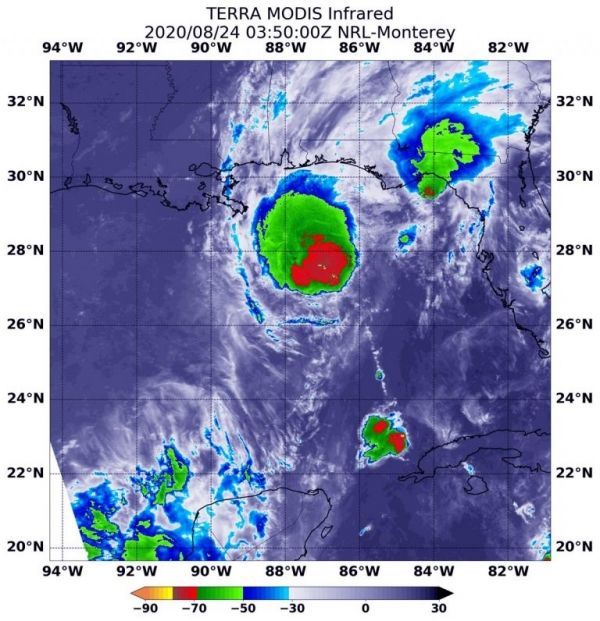 Marco is feeling the effect of strong southwesterly wind shear. On Aug. 23, the center, as identified by an Air Force Reserve Hurricane Hunter aircraft, was displaced to the southwest edge of the bulk of thunderstorms. That wind shear continues to affect and weaken Marco.