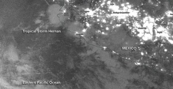 Nighttime imagery from NASA-NOAA’s Suomi NPP satellite revealed the Eastern Pacific Ocean’s Tropical Storm Hernan along the coast of western Mexico. By the weekend, Hernan is expected to absorb nearby Tropical Storm Iselle.