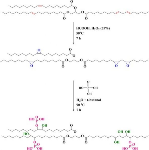 Figure: Synthesis of epoxidized sunflower oil (ESFO) and phosphorylated polyol (Phospol). CREDIT: Kazan Federal University